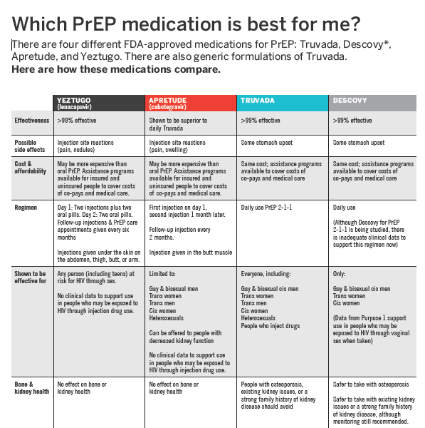Table comparing four FDA-approved medications for PrEP – Yeztugo, Apretude, Truvada, Descovy