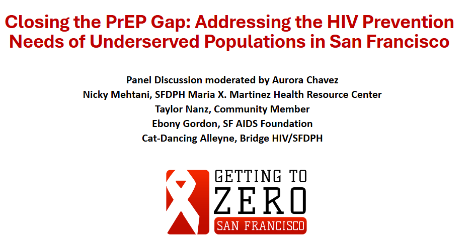 We had a phenomenal panel discussion with Dr. Nicky Mehtani (SFDPH/MXM), Ebony Gordon (SFAF), Taylor Nanz (Solid Ground), and Cat-Dancing Alleyne (Bridge HIV), who offered valuable insights and suggestions on how to increase PrEP knowledge and access for underserved populations in San Francisco. Dr. Al Liu and Aurora Chavez, Co-Chairs of the PrEP Committee, organized the main program.